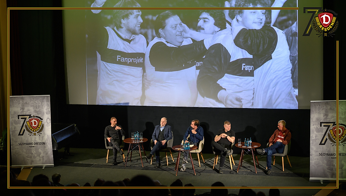 Rund 200 Dynamo-Fans waren am späten Sonntagnachmittag in die Schauburg gekommen, an jenen Ort also, an dem die Sportgemeinschaft vor 70 Jahren gegründet wurde. Unter ihnen befanden sich auch die Vize-Präsidenten Michael Bürger und Ronny Rehn. Die Protagonisten des Tages saßen jedoch auf der Bühne des Kinosaals: Matthias Maucksch, René Beuchel und Detlef Schößler erinnerten sich in einer von Uwe Karte moderierten Talkrunde mit an die Bundesliga-Jahre 1994 und 1995. Jeweils 30-minütige Filme über beide Jahre versetzten die ehemaligen Bundesliga-Profis wie die zahlreichen anwesenden Fans zurück in eine ganz besondere Zeit unserer Vereinsgeschichte.