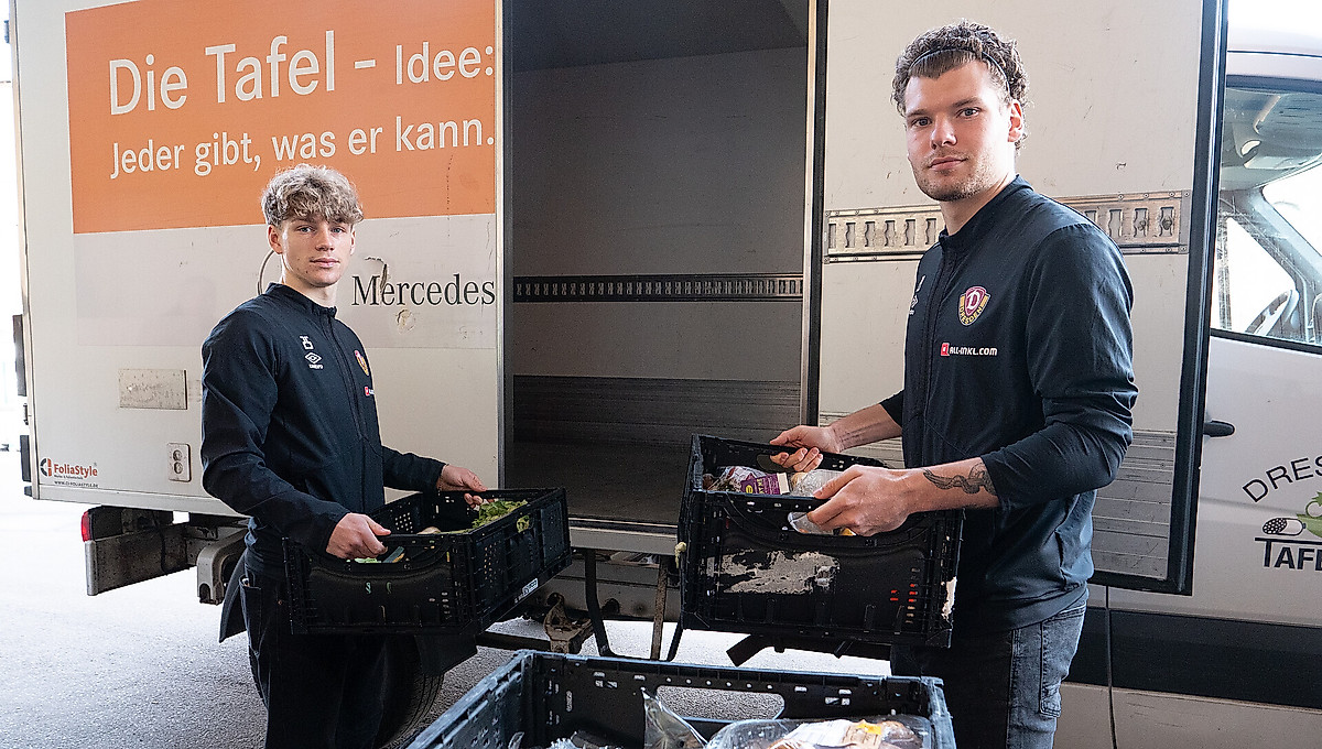 Kevin Ehlers und Jonas Oehmichen waren beeindruckt: Die Dresdner Tafel im Stadtteil Plauen ist weit mehr als eine kleine Suppenküche. Vier bis fünf Tonnen Lebensmittel werden hier umgeschlagen – jeden einzelnen Tag. Die Dimension, in welcher auf der Zwickauer Straße Hilfe für bedürftige Menschen organisiert wird, ist von außen kaum zu erahnen. Umso interessanter war der Einblick, den die beiden Spieler der SGD vor Ort erhielten.