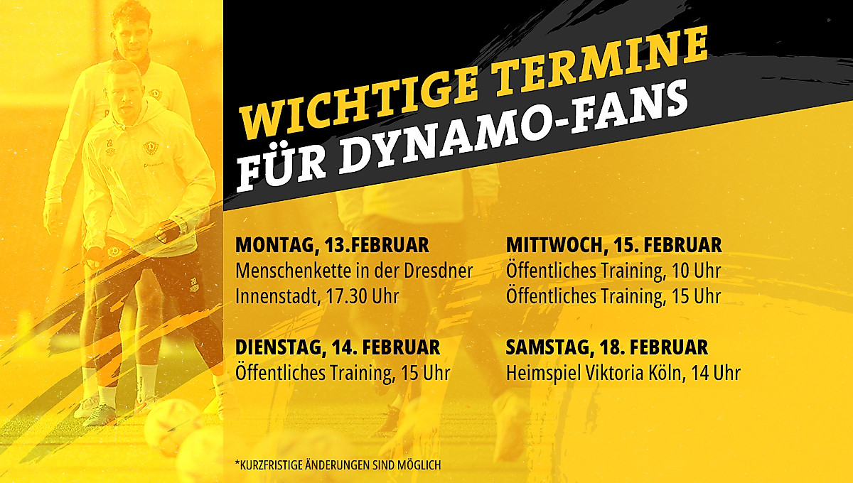 Während die Mannschaft am Montag noch trainingsfrei hat, steht für Dynamo-Fans bereits der erste wichtige Termin an: Die Sportgemeinschaft wird am Abend in der Dresdner Innenstadt an der Menschenkette teilnehmen und so ein Zeichen für Frieden setzen. Am Dienstag und Mittwoch gibt es öffentliche Trainingseinheiten, bevor am Wochenende Viktoria Köln zu Gast im Rudolf-Harbig-Stadion ist.