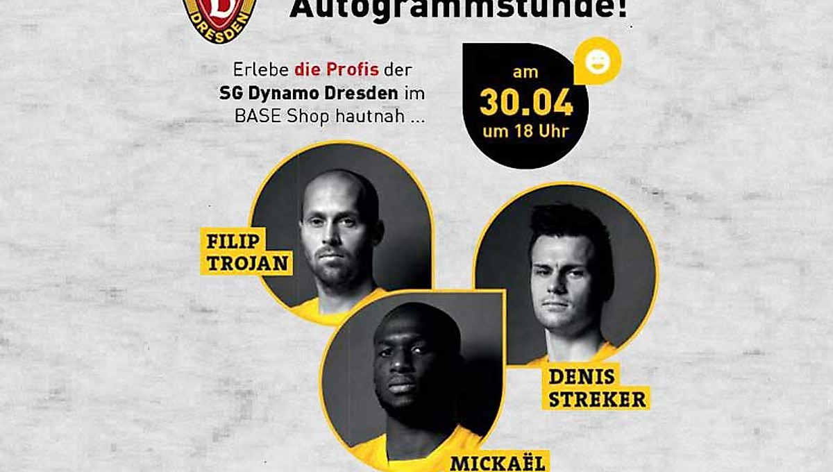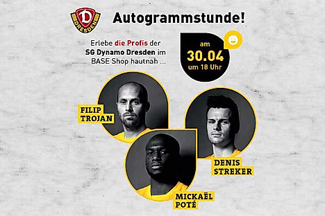 Am Dienstag, dem 30.04.2013, zwischen 18 und 19 Uhr, sind die Dynamo-Profis Mickaël Poté, Filip Trojan und Denis Streker bei einer Autogrammstunde im BASE Shop im Elbepark Dresden zugegen. Die Zweitliga-Profis der SG Dynamo Dresden erfüllen bei der Veranstaltung im BASE Shop gern die Autogrammwünsche der kleinen und großen Anhänger der SGD.