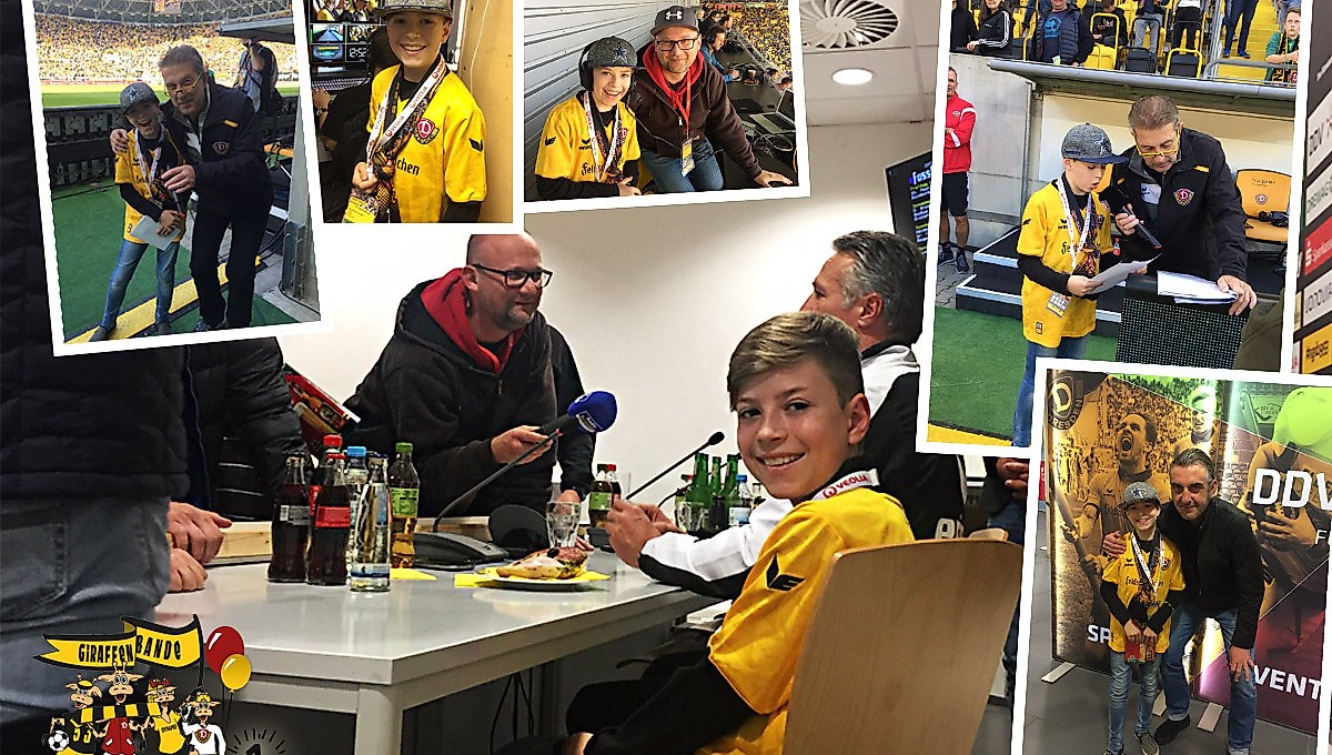Anlässlich des ersten Geburtstages hat sich die Giraffenbande etwas ganz Besonderes ausgedacht. Dynamos pädagogisches Freizeitangebot loste ein Mitglied aus, das einen ganz außergewöhnlichen Tag beim Heimspiel gegen den FC Ingolstadt 04 erleben durfte.Der glückliche Gewinner hieß Corey und ist 11 Jahre alt. Der gebürtige Dresdner erhielt einen Einblick hinter die Kulissen eines Heimspiels seines Lieblingsvereins. Nach einem Rundgang durch den Stadioninnenraum, die Mixed Zone, den PK-Raum und die Pressetribüne ging es für Cory ans Stadionmikrofon. Gemeinsam mit Dynamos Stadionsprecher Peter Hauskeller führte der 11-Jährige als Co-Moderator durch das Stadionprogramm. Dabei las Corey unter anderem vor prallgefüllten Rängen im DDV-Stadion die Geburtstagsgrüße vor und gab ein Interview über die Giraffenbande.