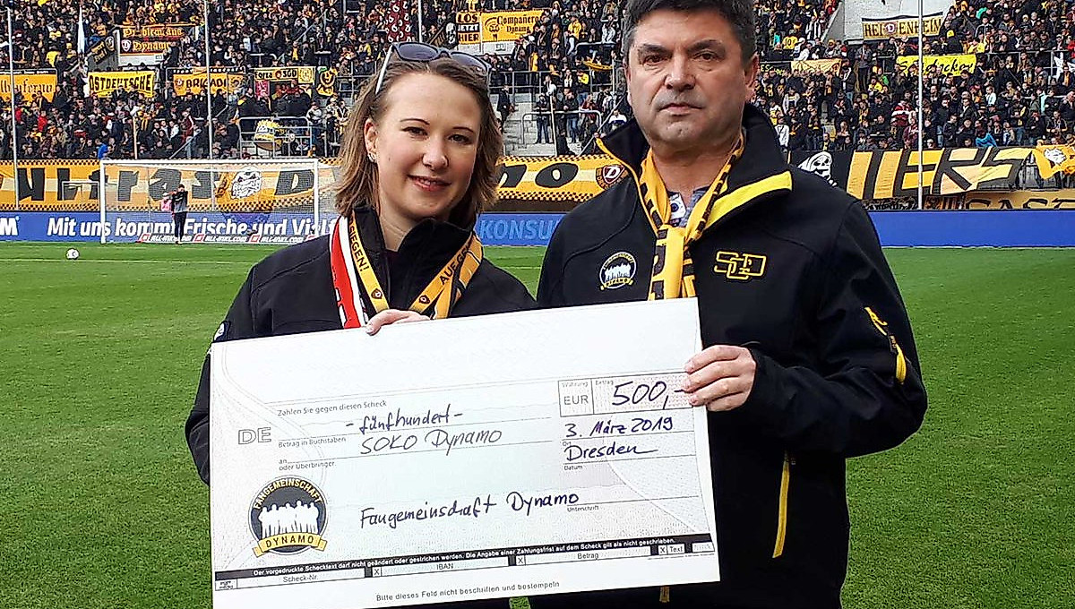 Eine schwarz-gelbe Faninitiative unterstützt die andere: Die Fangemeinschaft Dynamo e.V. hat dem „SolidaritätsKomitee Dynamo“ zum Heimspiel gegen Bochum einen Spendenscheck über 500 Euro überreicht.Das Geld stammt aus dem Erlös des 4. Dynamo-Skatturniers.