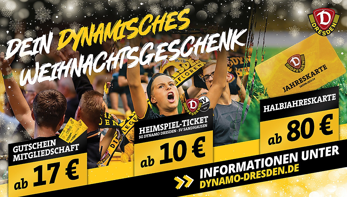 Der Lohn für die starken Leistungen der vergangenen Monate soll im Mai 2024 entgegengenommen werden. Gemeinsam wollen wir die Rückkehr in die zweithöchste Spielklasse des deutschen Fußballs feiern. Mit einem Dynamischen Weihnachtsgeschenk gibst Du Deinen Liebsten die Chance, hautnah im Stadion dabei zu sein.
