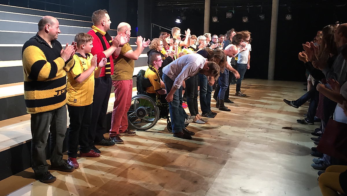 Fesselnd wie ein dramatisches Fußballspiel, zog die knapp 90-minütige Inszenierung der Bürgerbühne den ausverkauften Saal in ihren Bann. Die mitreißende Leistung der 19 Darsteller, die noch nie zuvor auf einer Bühne gestanden hatten, wurde nach dem „Schlusspfiff“ mit minutenlangem Applaus und stehenden Ovationen gewürdigt.