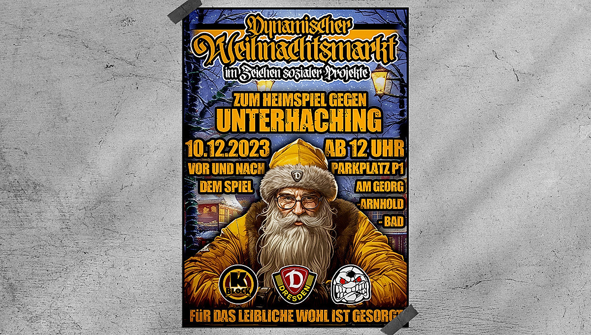 Rund um das Heimspiel gegen die SpVgg Unterhaching am Sonntag, dem 10. Dezember 2023, wird es auf dem Parkplatz P1 am Georg-Arnhold-Bad einen dynamischen Weihnachtsmarkt geben. Der gesamte Erlös fließt in soziale Projekte.