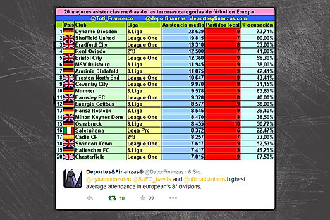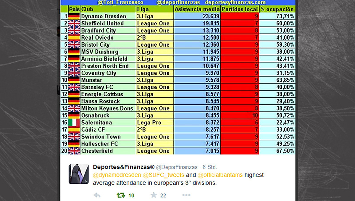 Der zuschauerstärkste deutsche Drittligist nach Dynamo Dresden ist derzeit der MSV Duisburg. Die Meidericher belegen mit 11.945 Fans pro Heimspiel den sechsten Platz im europaweiten Ranking, direkt vor Arminia Bielefeld (11.875). Mit Preußen Münster, Energie Cottbus, Hansa Rostock, VfL Osnabrück und dem Halleschen FC befinden sich insgesamt acht deutsche Vereine unter den Top-20 der europaweit zuschauerstärksten Drittligisten. Neun Clubs kommen aus Großbritannien, zwei aus Spanien – darunter mit Real Oviedo auf Platz Vier ein weiterer großer Traditionsverein und langjähriger Erstligist –, ein Verein stammt aus Italien.