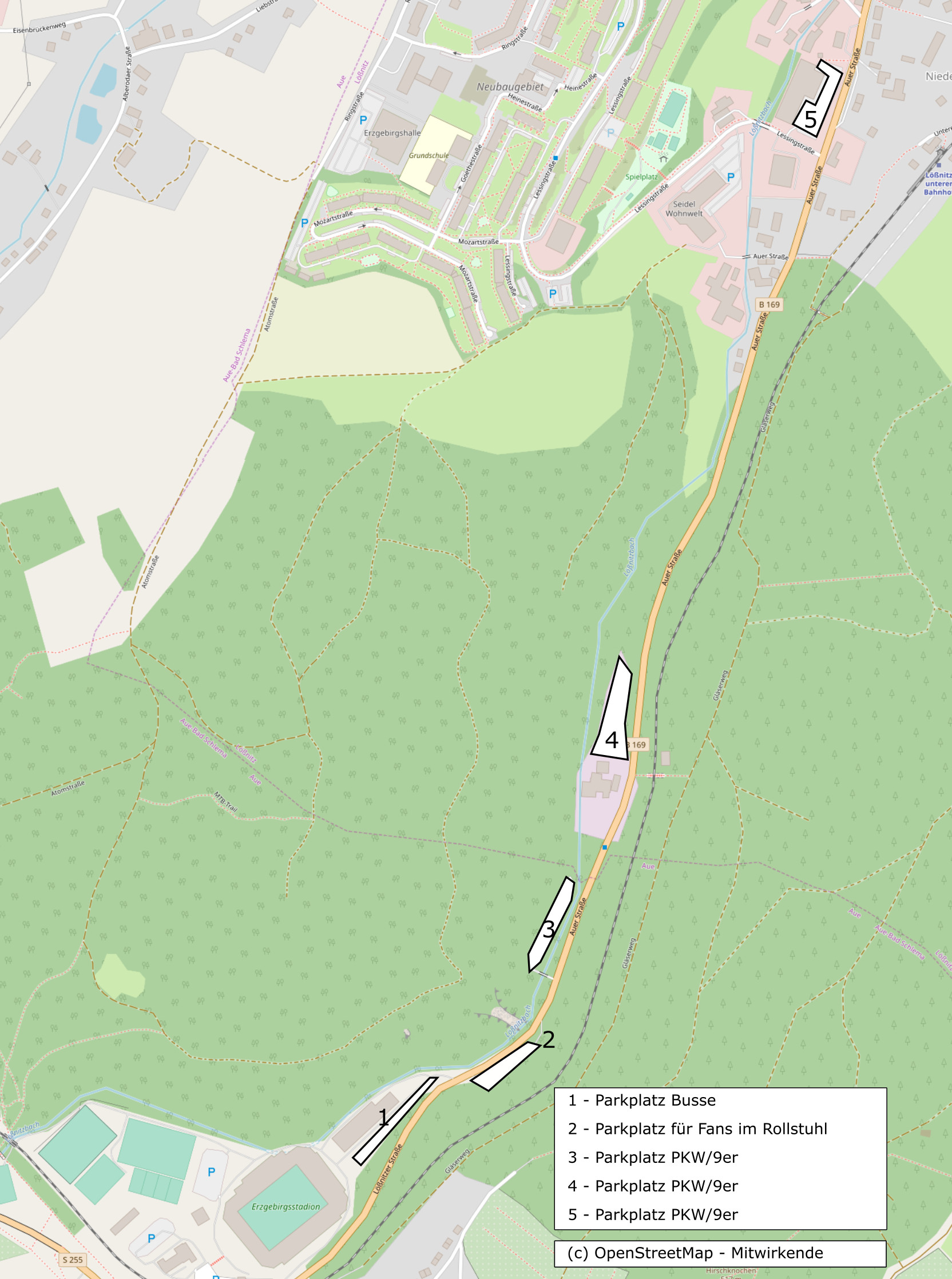 Wir empfehlen euch eine frühzeitige Anreise über die A72. Verlasst die Autobahn an der Anschlussstelle Stollberg-West und fahrt weiter auf der Bundesstraße 169 bis nach Lößnitz. Ab Lößnitz stehen an der B169 in Richtung Aue in unmittelbarer Nähe zum Stadion drei Gäste-Parkplätze sowie ein Parkplatz für Fans mit Behinderung zur Verfügung. Die Parkplätze sind gebührenpflichtig (PKW 3 Euro und Reisebusse 15 Euro) -> Orientierungsskizze.