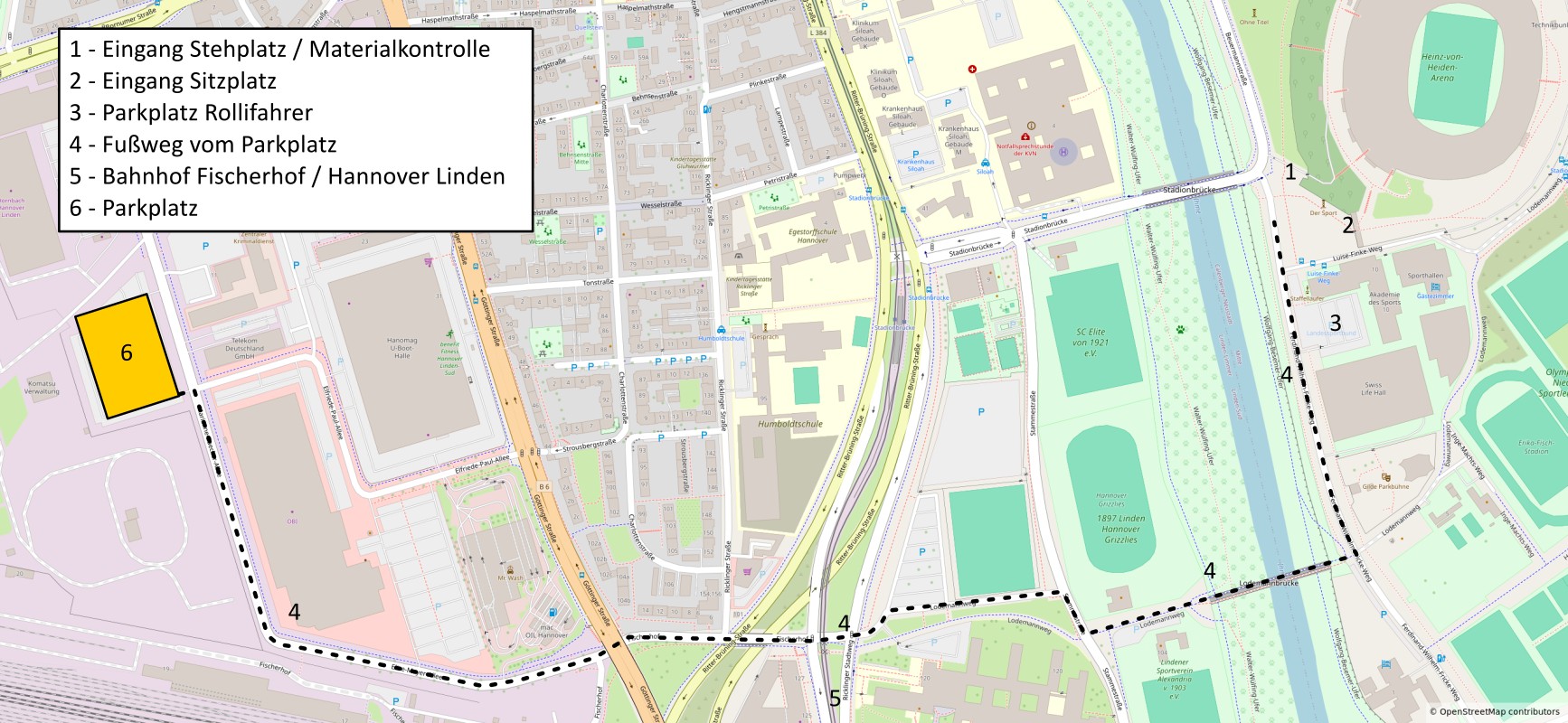 Fans die mit dem Zug anreisen, nutzen bitte vom Hauptbahnhof Hannover die S-Bahn Linien S1 (in Richtung Haste), S2 (in Richtung Haste), S5 (in Richtung Paderborn). Steigt an der Haltestelle Hannover-Linden/Fischerhof aus. Folgt dann den weiteren Fußweg wie in der Orientierungsskizze angezeigt. (Fischerhof-Lodemannweg-Lodemannbrücke-Ferdinand-Wilhelm-Fricke-Weg)