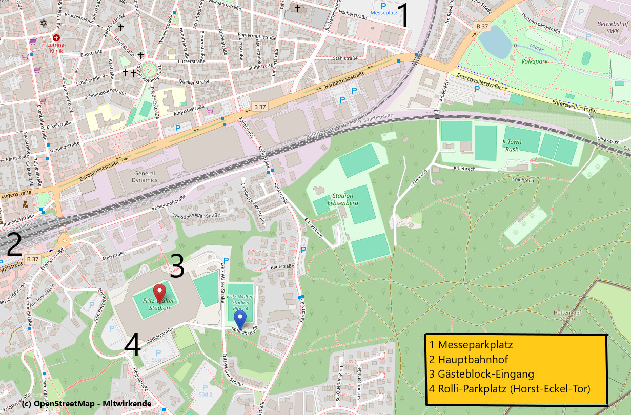 Rollstuhlfahrende parken bitte auf dem Parkplatz „Süd 1“. Der Eingang zum Stadion ist neben dem "Horst-Eckel-Tor" an der Tür W2.