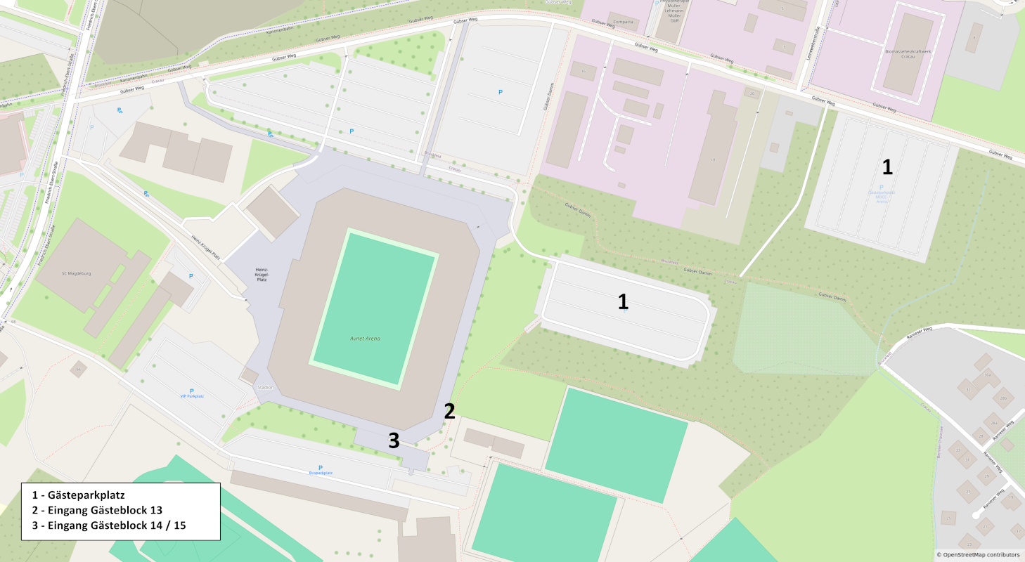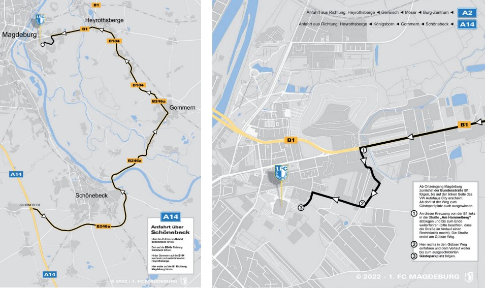 Über die A14 bis zur Abfahrt Schönebeck fahren. Dort auf die B246a Richtung Gommern fahren. Hinter Gommern auf die B184 wechseln und weiterfahren bis Heyrothsberge. Hier auf die B1 Richtung Magdeburg wechseln. Ab Ortseingang Magdeburg geht es zunächst weiter auf der B1 (Berliner Chaussee) bis auf der linken Seite das VW Autohaus City erscheint. (Ab dort findet ihr auch eine Beschilderung zum Gästeparkplatz). Dort links in die Straße „Am Hammelberg“ einfahren und bis zum Ende weiterfahren (bitte beachten, dass die Straße im Verlauf einen Rechtsknick macht). Die Straße endet am Gübser Weg. Hier rechts einfahren und weiter bis zu den ausgeschilderten Gästeparkplätzen. Die Parkgebühr für Pkws/Neunsitzer beträgt 5,00 Euro, für Fanbusse 10,00 Euro. Der Gästeparkplatz öffnet um 17:30 Uhr. Bitt e erst ab Hammelberg die Adresse Gübser Weg eingeben, da sonst die Gefahr besteht, dass ihr im Heimbereich landet. Die Gästefanbusse fahren eine leicht veränderte Route und fahren zunächst auf der B1 (Berliner Chaussee) weiter bis sich die B1 gabelt. Dann links einordnen und auf der Berliner Chaussee weiterfahren bis zur Paul-Ecke-Straße. Dort links einfahren und über Leineweberstraße bis zum Gübser Weg fahren. Hier ebenfalls links einfahren und und weiter bis zu den ausgeschilderten Gästeparkplätzen. Die Fanbusse benutzen den vorderen Parkplatz. Eine Anreise durch Magdeburg ist auf Grund von umfangreichen Baumaßnahmen in der Innenstadt und der starken Frequentierung durch Heimfans nicht zu empfehlen.