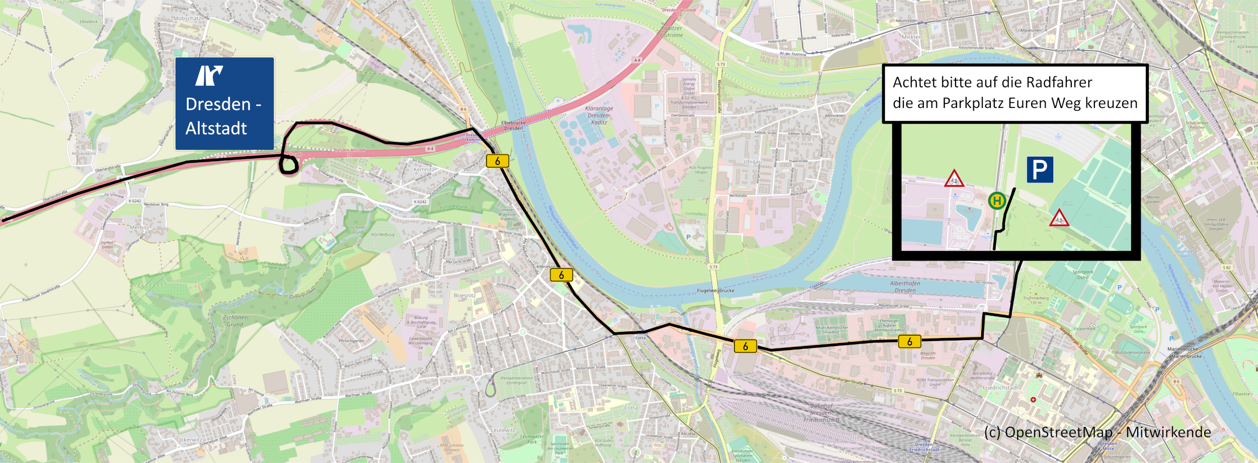 Die Anreise erfolgt über die BAB 4 an der Anschlussstelle Dresden-Altstadt (AS78) Ab dort bitte der B6 über die Meißner Landstraße, Hamburger Straße, Bremer Straße, Waltherstraße, Magdeburger Straße in Richtung Zentrum/ Messe zu folgen. Von der Magdeburger Straße ist dann nach links in die Schlachthofstraße abzubiegen. Nach ca. 150 m befindet sich auf der rechten Seite am Trümmerberg die Zufahrt zum Gästeparkplatz. Dort sind ausreichend Stellflächen sowie Toiletten vorhanden. Vom bewachten Parkplatz zum Stadion wird ein Bus-Shuttleverkehr eingerichtet, um einen sicheren und zeitgerechten Transfer zum Stadion zu gewährleisten. Der Rückweg nach Spielende vom Stadion zum Gästeparkplatz erfolgt ebenfalls mit Shuttle-Bussen.