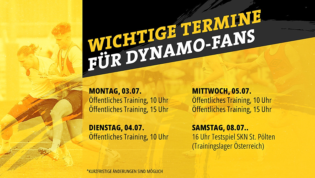 Am Freitag, dem 7. Juli, reist die Drittligamannschaft zum siebentägigen Trainingslager ins österreichische Walchsee und wird direkt am darauffolgenden Tag ein Testspiel gegen den SKN St. Pölten absolvieren. Zuvor finden in Dresden noch fünf öffentliche Trainingseinheiten statt.