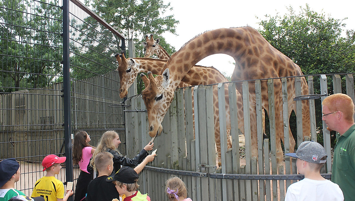 Im vergangenen Jahr hat die SG Dynamo Dresden die Patenschaft für die Giraffen-Dame Gaia im Dresdner Zoo übernommen. Grund genug für unsere „Giraffenbande“, Gaia einen Besuch abzustatten.Am 17. und am 31. Mai hatten jeweils 15 Kinder die Möglichkeit, unter fachkundiger Anleitung der Tierpfleger Gaia und ihre beiden Artgenossen zu füttern. Jeder, der wollte, durfte Knäckebrot mit den drei Giraffen teilen.
