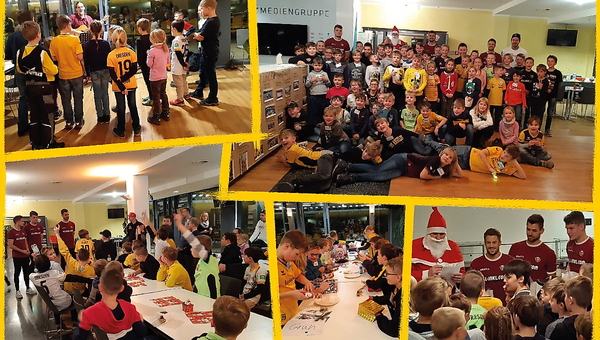 Knapp zwei Wochen vor Heiligabend gab es für die Giraffenbande bereits eine vorweihnachtliche Überraschung. Im VIP-Bereich des Rudolf-Harbig-Stadions feierten 59 Kinder eine dynamische Weihnachtsfeier.{media-right-nachwuchs-adv}Egal ob der Bastelstand von „Oskarshausen“, die von „1953international“ betreute Bastel- und Malstraße, der Tischkicker oder die beliebte Buttonmaschine – für alle Kids war etwas tolles dabei.