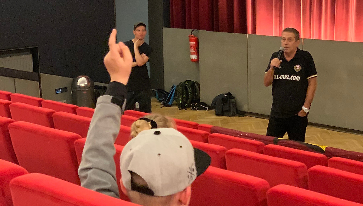 Die Kinder löcherten Dynamos Urgestein mit diversen Fragen und Hauskeller erzählte ausführlich aus seinem Alltag als Stadionsprecher bei der SGD.