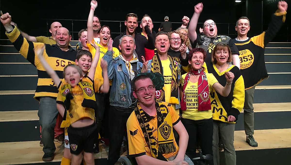 Die Darstellerinnen und Darsteller staunten am Dienstagabend nicht schlecht, als in der – wie immer ausverkauften – Vorstellung im Kleinen Haus des Staatsschauspiels Dresden Justin Eilers aus einem Bühnenaufgang trat. Für ein paar Minuten wurde der 27-Jährige Teil der Vorstellung des phantastisch spielenden Laien-Ensembles aus fußballverrückten Dynamo-Anhängern zwischen 6 und 54 Jahren. Am Ende war es für alle Beteiligten ein unvergessliches Erlebnis.