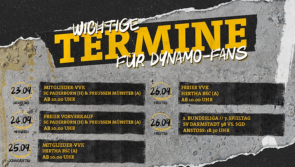 Dennoch gibt es einige wichtige Termine für alle Schwarz-Gelben: Am Dienstag, dem 23. September, beginnt um 10 Uhr der Mitgliedervorverkauf für die Tickets zum Heimspiel gegen den SC Paderborn und für das Auswärtsspiel bei Preußen Münster. Eventuelle Resttickets gehen am Folgetag ebenfalls ab 10 Uhr in den freien Verkauf.