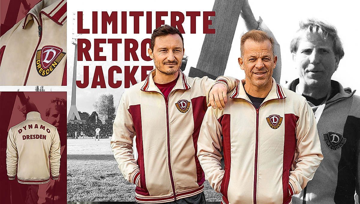 Zum Training und der Spielvorbereitung wurde sie von Vereinslegenden wie Hans-Jürgen „Dixie“ Dörner, Ulf Kirsten und Ralf Minge getragen, in ihr reckte Trainer Klaus Sammer nach zwei erfolgreichen Finals den FDGB-Pokal 1984 und 1985 in die Höhe, nun ist eine authentische Nachbildung der Retro-Trainingsjacke in limitierter Auflage im Fanshop erhältlich. Dabei wurde auf viele Details Wert gelegt. Ein auffälliger weinroter Kontraststreifen auf cremeweißen Grund verkörpert den unverwechselbaren Stil vergangener Jahre, der große „DYNAMO DRESDEN“-Schriftzug auf der Rückseite sowie das Wappen auf der Brust sorgen für eine gehörige Portion Identität. Hochwertiges Material bietet zusätzlich maximalen Komfort und Langlebigkeit. Entstanden ist eine zeitlose Jacke, die zeigt, dass die Leidenschaft für die Sportgemeinschaft unvergänglich ist.