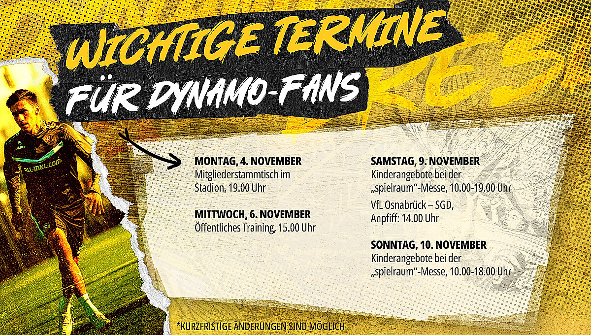 Nach zwei Englischen Wochen in Folge kommt etwas Ruhe in den Alltag der Sportgemeinschaft und so kann auch endlich wieder eine öffentliche Einheit in der AOK PLUS Walter-Fritzsch-Akademie stattfinden. Außerdem wartet ein Mitgliederstammtisch zur Vorbereitung auf die Mitgliederversammlung am 16. November auf alle Schwarz-Gelben. Am Wochenende kommt es dann zum Aufeinandertreffen mit Zweitligaabsteiger Osnabrück. Wer die Reise nach Niedersachsen nicht mit antreten kann, dem sei dabei die „spielraum“-Messe ans Herz gelegt, auf der Dynamo seine Kinderangebote vorstellt.