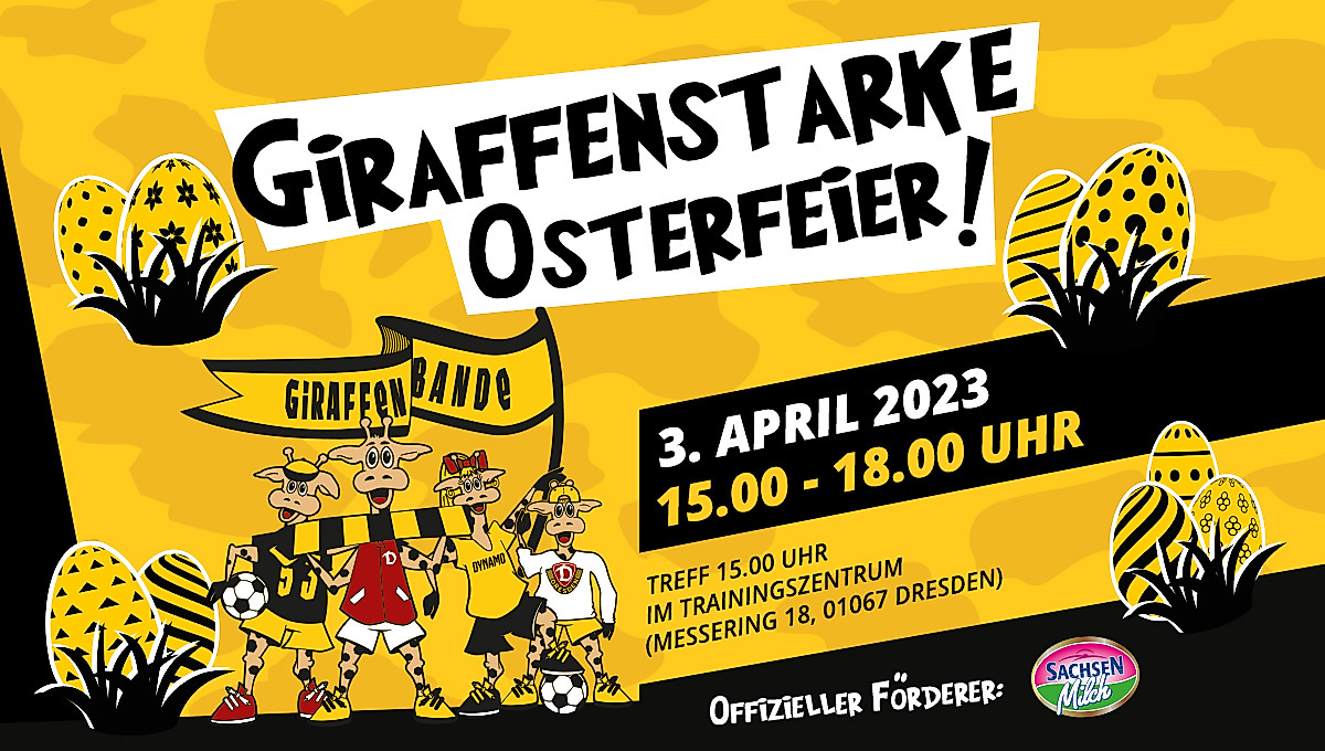 „Giraffis“ und Freunde aufgepasst! Am Montag, dem 3. April 2023, findet in der AOK PLUS Walter-Fritzsch-Akademie eine Osterfeier mit vielen tollen Aktionen für den schwarz-gelben Nachwuchs statt. Neben Giraffenbanden-Vereinsmitgliedern können auch Freunde kostenlos bei unserer Ostersause vorbeischauen.