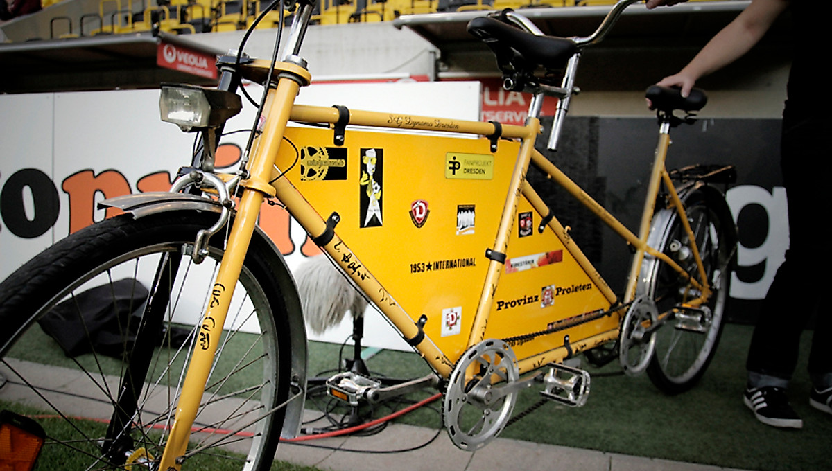 {media-right}Anfang des Jahres entschied sich die Fangemeinschaft Dynamo dazu, ein eigenes Fahrrad zusammenzubasteln. Es sollte jedoch kein einfaches Bike sein und nach einigen Überlegungen entschied man sich für ein Tandem. In Eigenregie wurde ein fahrbarer Untersatz gefunden und in unzähligen Arbeitsstunden zunächst in alle Einzelteile zerlegt. Weil das Fahrrad im Ergebnis ein symbolisches Gemeinschaftsprojekt möglichst vieler Fans werden sollte und die Umstände beim Schrauben einfach nicht zuließen, mehrere Anhänger ins Boot zu holen, gab es durch die Fangemeinschaft Dynamo einen Aufruf, das Tandem mit Logos und Schriftzügen der Fanclubs und Fangruppen der SGD zu verzieren. Die Resonanz war positiv und ein Dank geht an dieser Stelle an alle, die sich an der Umsetzung der Sache beteiligten. Umfangreiche fachliche Hilfe bekamen die Fan-Schrauber auch von der Fahrradselbsthilfewerkstatt „Radschlag“. Wenn der eigene Drahtesel mal wieder den Geist aufgibt, könnt ihr dort jederzeit vorbeischauen, um ihn wieder auf Vordermann zu bringen. Mit Rat und Tat begleitete das Team die Arbeiten, die sich über mehrere Wochen hinzogen und viel Zeit und Schweiß kosteten. Um im zweiten Arbeitsschritt die typische Dynamo-Farben aufzutragen, wurde vorher mit einem Sandstrahler der gute Originallack abgetragen. Die eingeschickten Fan-Logos und –schriftzüge bekamen schließlich ihren Platz auf einer extra zugeschnittenen Rahmenplatte.