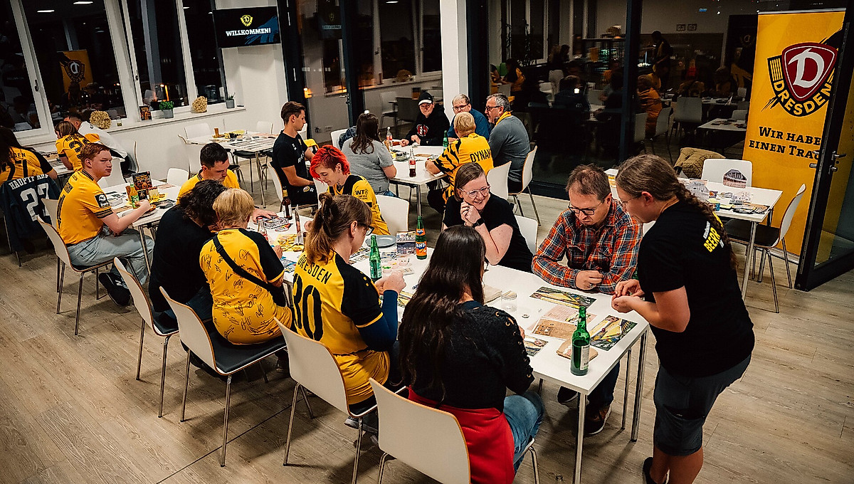 Gut gefüllt begann der Spielespaß in der Cafeteria des Trainingszentrums kurz nach 19 Uhr mit einem gemeinsamen Eröffnungsspiel, bevor sich die Anwesenden auf verschiedene Tische verteilten. In drei Schwierigkeitsstufen konnten sich Dynamos Mitglieder unter anderem bei den Spielen „Legenden Stammtisch“, „Dynamos wilde 90er“ oder „Die Legende aus Elbflorenz“ beweisen. Unter die Spielerinnen und Spieler mischten sich auch die beiden Profis Daniel Mesenhöler und Jakob Lemmer, die im Anschluss an die Veranstaltung auch für Foto- und Autogrammwünsche zur Verfügung standen.