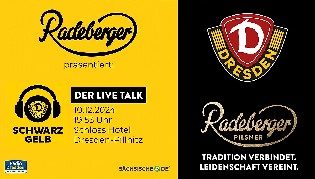 Am Dienstag, dem 10. Dezember, findet drei Tage vor dem letzten Heimspiel 2024 auch der letzte Live-Talk des „SCHWARZ GELB“-Podcasts für das Jahr 2024 statt. Diesmal grüßen die Moderatoren Jens Umbreit und Tino Meyer aus dem Schloss Hotel in Pillnitz. Mit dabei: Dynamo-Kapitän Stefan Kutschke.