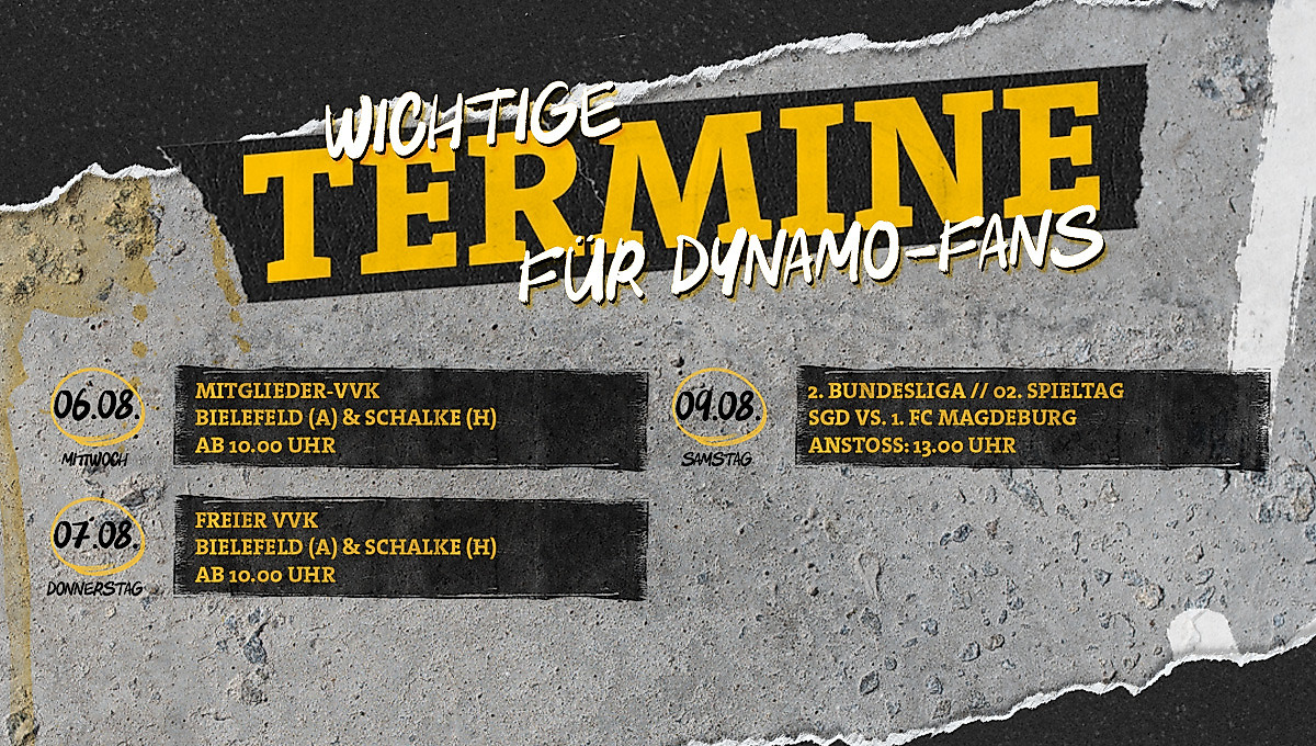 Bevor es am Samstag im Hexenkessel Rudolf-Harbig-Stadion zum ersten Mal in der Spielzeit 2025/26 so richtig laut wird, finden in dieser Woche noch die Vorverkäufe für die Partien beim DSC Arminia Bielefeld und gegen den FC Schalke 04 statt. Ab Mittwoch, dem 6. August, haben Vereinsmitglieder ab 10 Uhr die Möglichkeit, sich ihre Tickets für beide Spiele zu sichern. Einen Tag später, am Donnerstag, dem 7. August, gehen eventuell verbleibende Karten ab 10 Uhr in den freien Verkauf.
