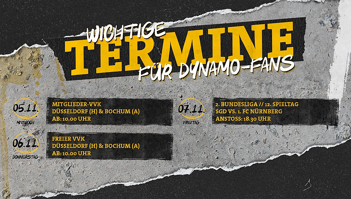 Für alle Schwarz-Gelben, die zum Heimspiel gegen Düsseldorf oder in Bochum dabei sein wollen, gilt es am Mittwoch und Donnerstag schnell zu sein, denn dann gehen die Tickets für beide Spiele in den Verkauf. Am Mittwoch, dem 5. November, startet ab 10 Uhr wie gewohnt der Verkauf für alle Mitglieder der SGD. Eventuelle Resttickets gehen am Folgetag ebenfalls ab 10 Uhr in den freien Verkauf.