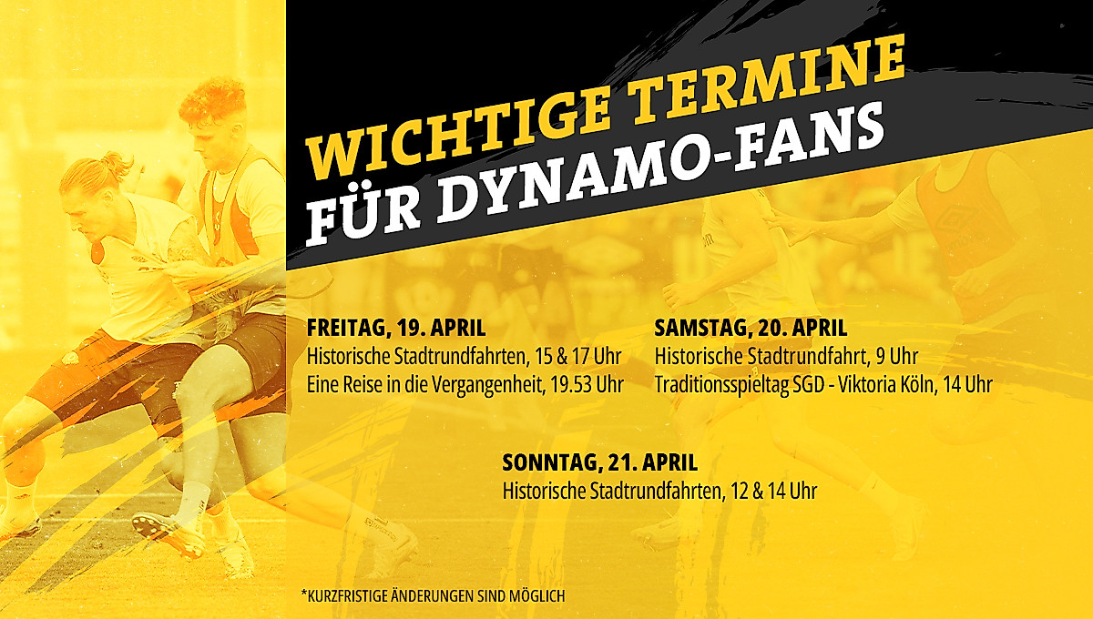 Bevor es am Samstag, dem 20. April, ab 14 Uhr auf dem Rasen im „Wohnzimmer“ um die drei Punkte in der Begegnung mit Viktoria Köln geht, startet erneut eine Stadtrundfahrt um 9 Uhr am Stadion. Wem das zu früh ist, hat am Sonntag, dem 21. April jeweils 12 und 14 Uhr die Möglichkeit, Dresden aus Dynamo-Perspektive etwas genauer unter die Lupe zu nehmen.