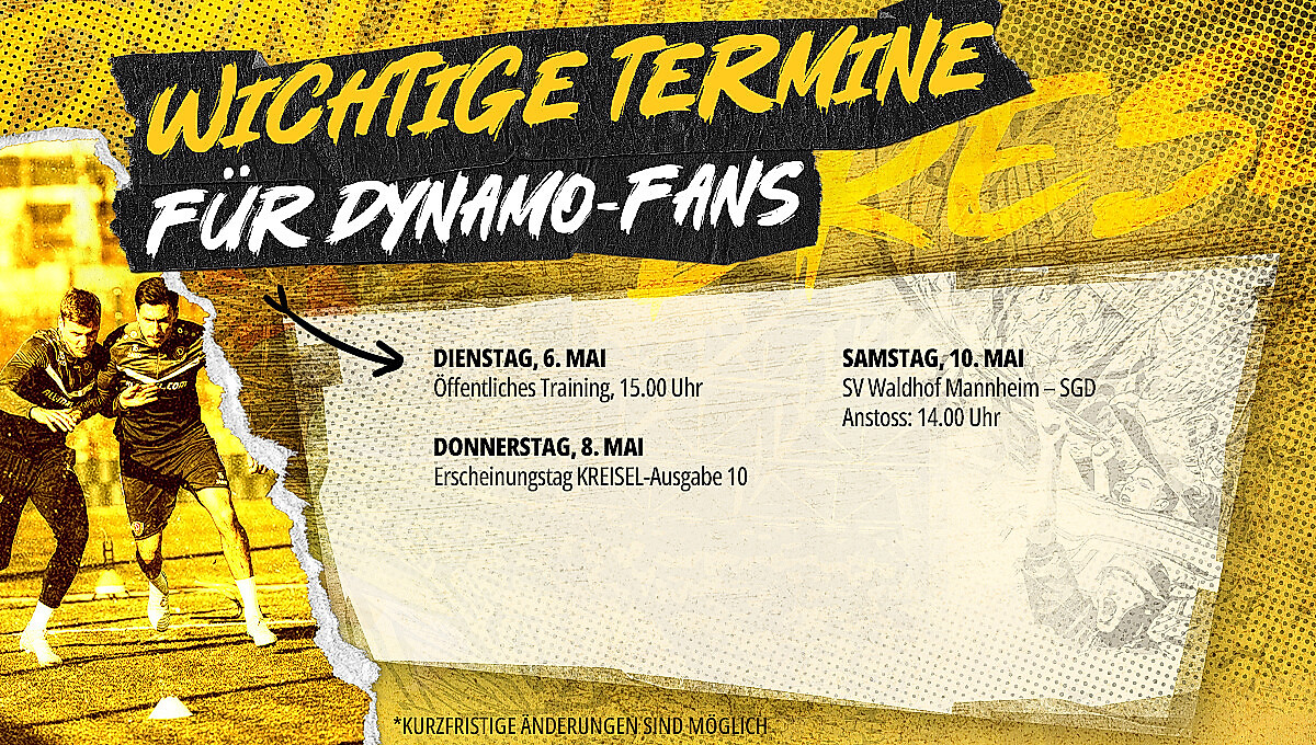 Um die Mannschaft in der Vorbereitung darauf nochmals zu unterstützen, sind alle Fans am Dienstag, dem 6. Mai 2025, auf das Gelände der AOK PLUS Walter-Fritzsch-Akademie eingeladen. Ab 15 Uhr bittet das Trainerteam rund um Thomas Stamm die Profis zur öffentlichen Einheit.