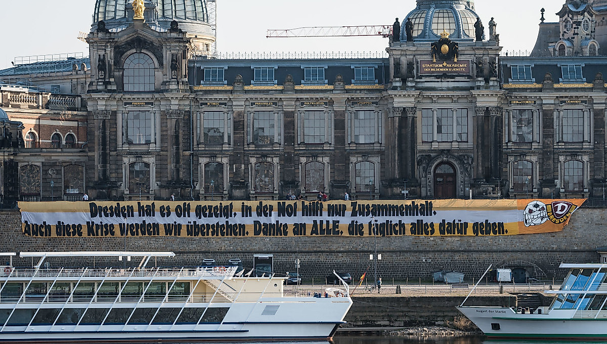 Der Kreis schließt sich: Wie mit der Landeshauptstadt Dresden und der Dresdner Philharmonie vereinbart, hat das große Solidaritäts-Spruchband der Ultras Dynamo, welches gut sichtbar eine Woche am Dresdner Kulturpalast hing, einen neuen Platz gefunden – dort wo die Aktion begann: an der Brühlschen Terrasse.Da nämlich hatte Dresdens aktive Fanszene am Dienstag vor zwei Wochen prominent ihre Solidarität mit den vielen Helferinnen und Helfern während der Corona-Pandemie zum Ausdruck gebracht.