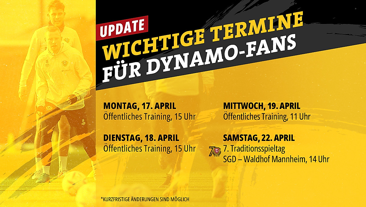 Am Samstag, den 22. April, steigt um 14 Uhr das Heimspiel gegen den Waldhof aus Mannheim. Bereits zum siebten Mal kommt es beim ersten Heimspiel nach dem Vereinsgeburtstag zum Traditionsspieltag. Zahlreiche Aktionen rund um das Spiel sollen an Dynamos ruhmreiche Geschichte erinnern. So ist etwa im Vorfeld ein Autokorso mit dynamischen Fahrzeugen geplant und der Dynamo-Kreisel erscheint als Sonderedition.