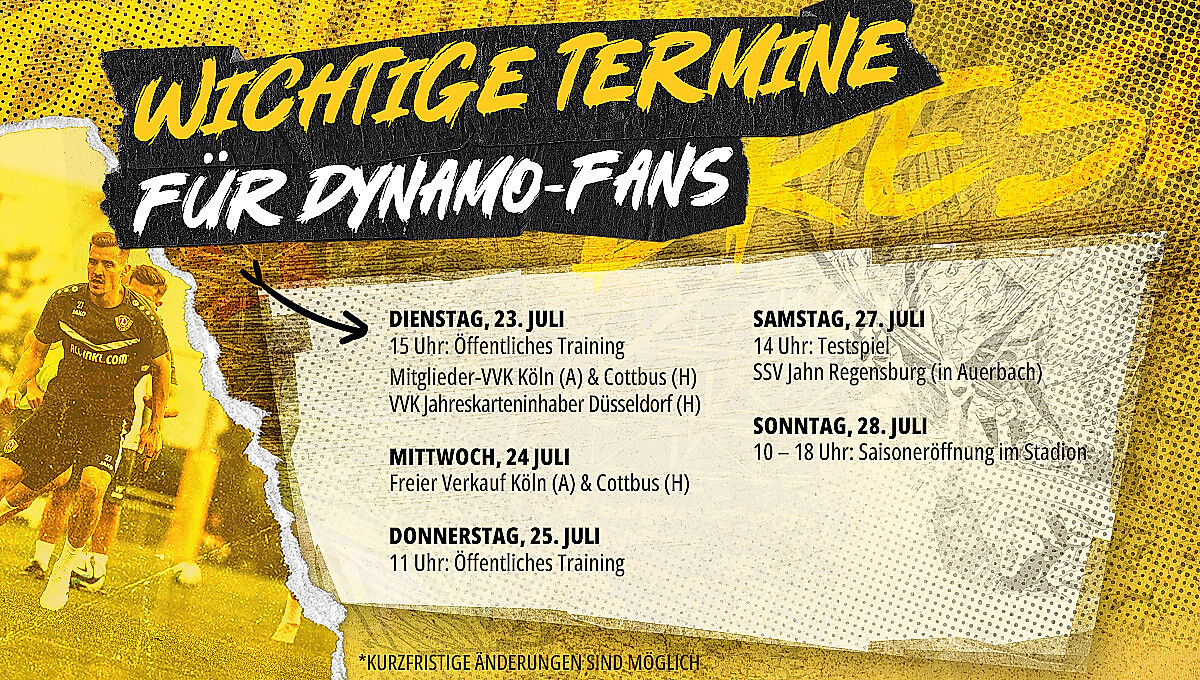 Am Dienstag um 15 Uhr und am Donnerstag um 11 Uhr haben Fans der SGD erneut die Möglichkeit, die Trainingsarbeit der Mannschaft hautnah in der AOK PLUS Walter-Fritzsch-Akademie zu verfolgen. Neben den öffentlichen Übungseinheiten gilt es in dieser Woche auch, die ersten Vorverkaufstermine für die vor uns liegende Spielzeit im Blick zu haben.