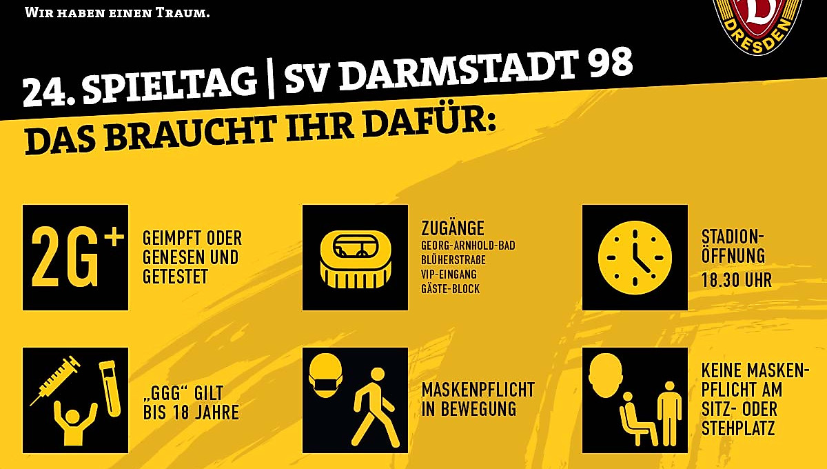 Am Samstagabend empfängt die SGD im Rahmen des 24. Spieltages um 20.30 Uhr den SV Darmstadt 98 im Rudolf-Harbig-Stadion. Dabei muss die SGD als Veranstalter des Heimspiels einige Bedingungen erfüllen, die sich unter anderem aus der Sächsischen Corona-Notfall-Verordnung dem Hygienekonzept ergeben.Wir geben Euch hier die Antworten auf die wichtigsten Fragen, die sich Euch für Euren Stadionbesuch im Rudolf-Harbig-Stadion stellen könnten: