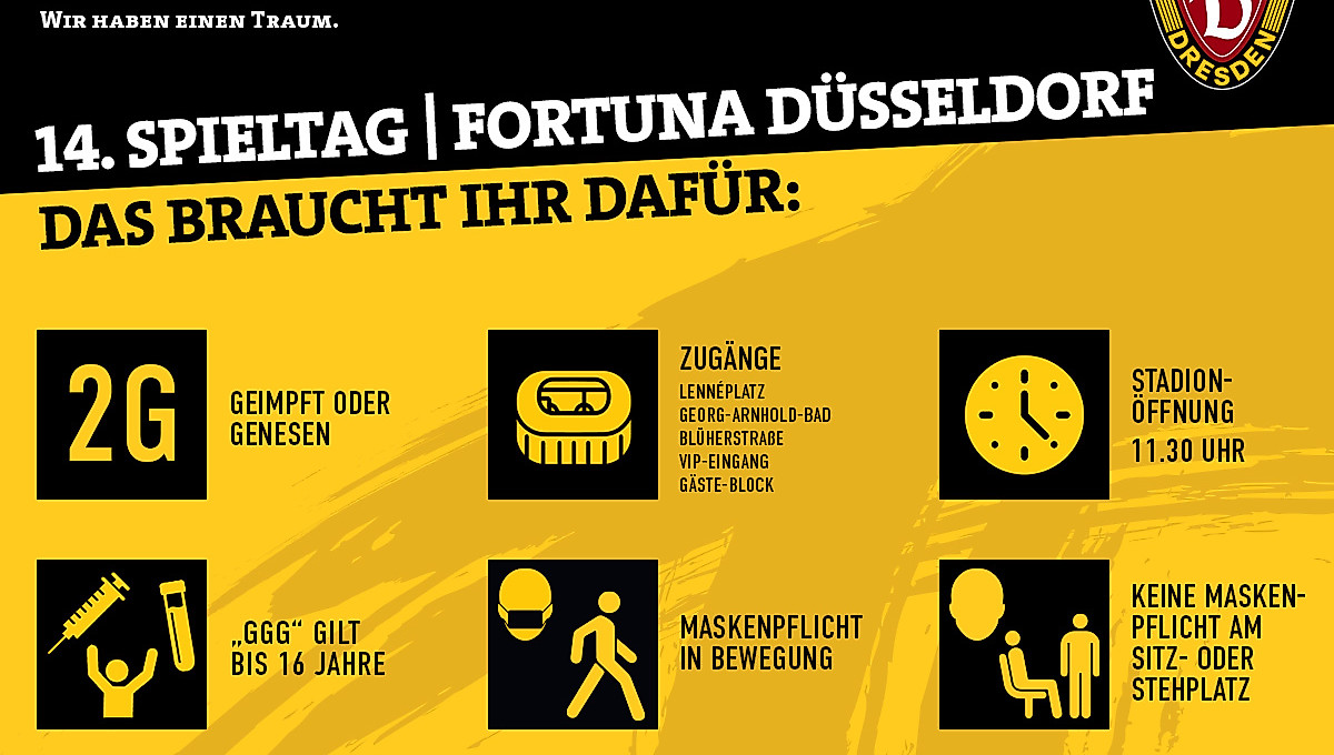 Am Sonntag empfängt die SGD im Rahmen des 14. Spieltages ab 13.30 Uhr Fortuna Düsseldorf im Rudolf-Harbig-Stadion.Dabei muss die SGD als Veranstalter des Heimspiels einige Bedingungen erfüllen, die sich unter anderem aus der Sächsischen Coronavirus-Schutz-Verordnung dem Hygienekonzept ergeben.