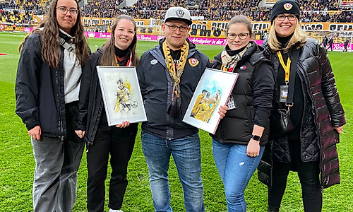 Bei der Fanzeit zum Heimspiel gegen Rot-Weiss Essen übergab Sylvie Löffler, Mitglied der FG sowie des Aufsichtsrates der SGD, symbolisch zwei Werke an Ronny Weinhold, der diese in Vertretung des erkrankten Ersteigerers auf dem Rasen entgegennahm. Dort waren mir Emelie Loos und Angelique Boldt auch zwei Künstlerinnen vertreten, welche die Bilder gemalt hatten. Ihnen gebührt, wie allen anderen Beteiligten, die an der Umsetzung des Projekts beteiligt waren, ein ganz besonderer Dank.