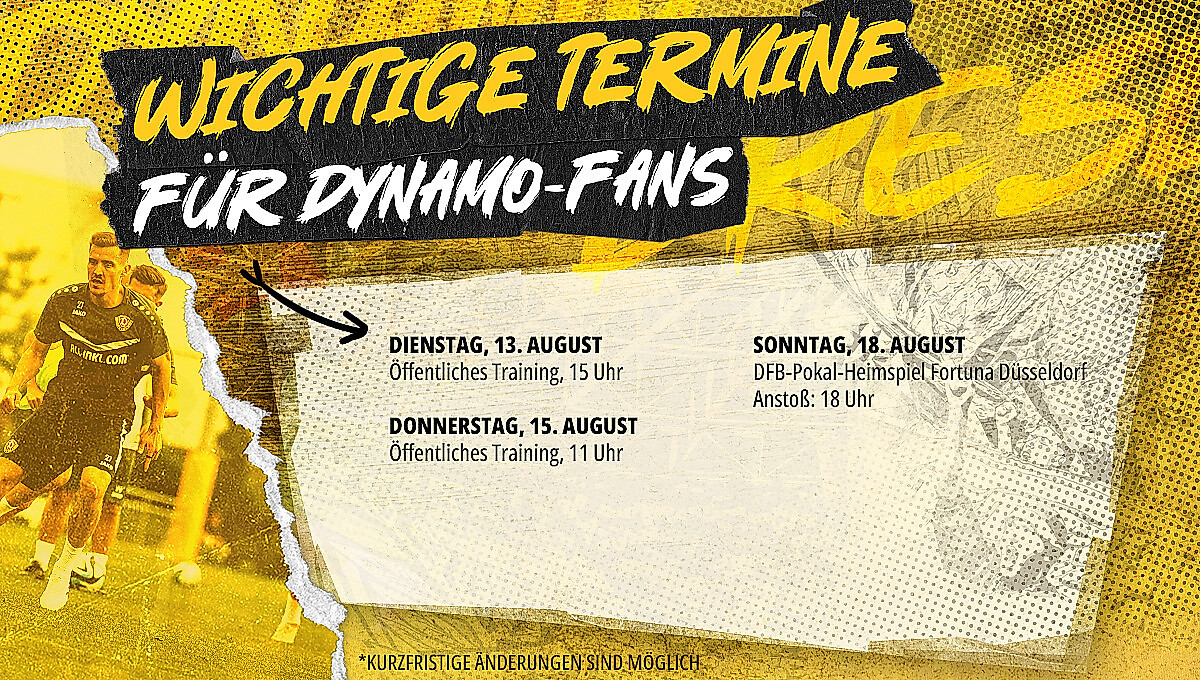 In der neuen Woche wartet auf die Sportgemeinschaft direkt das nächste Heimspiel. Am Sonntag empfängt Dynamo in der 1. Hauptrunde des DFB-Pokals Fortuna Düsseldorf. Die Vorbereitung auf die Partie startet die Mannschaft von Cheftrainer Thomas Stamm dann am Dienstag. Am Nachmittag des 13. August sind bei der öffentlichen Trainingseinheit ab 15 Uhr alle Fans herzlich in die AOK PLUS Walter-Fritzsch-Akademie eingeladen.