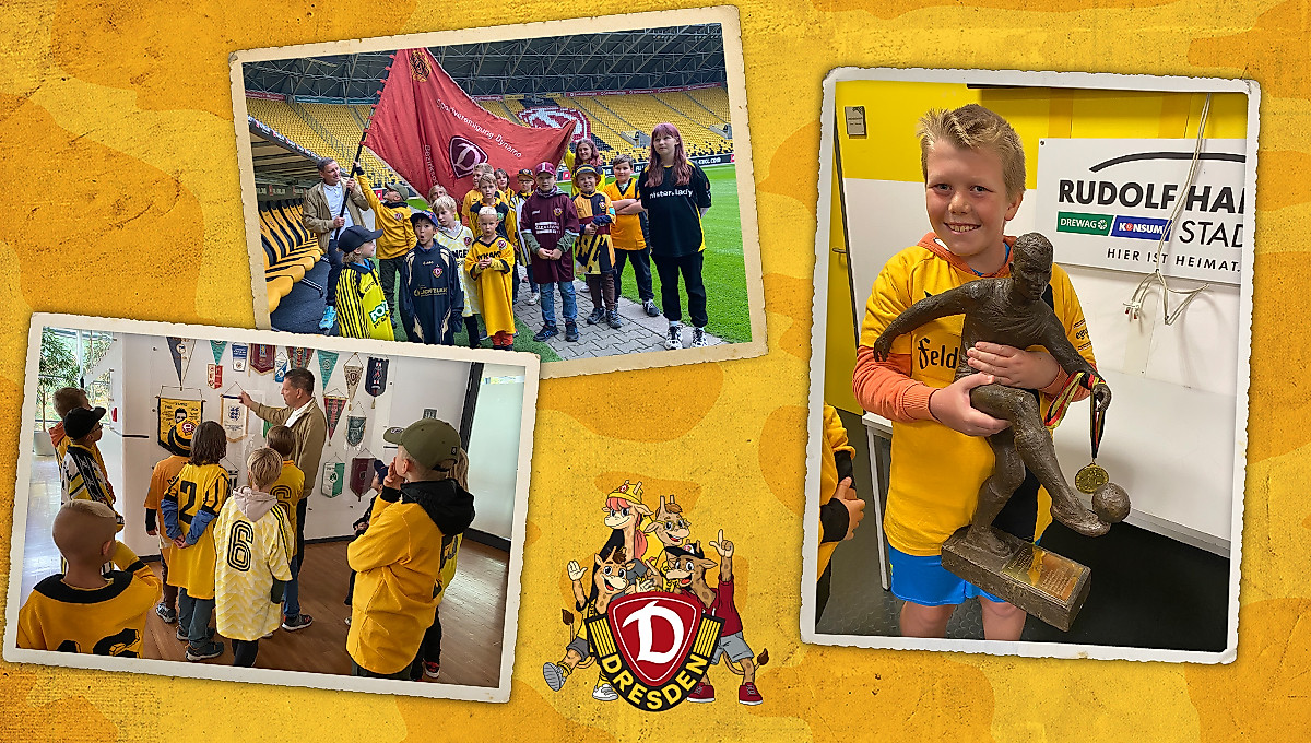 Eine gute Woche später fanden sich erneut 15 Kinder im „Wohnzimmer“ der SGD zusammen. Diesmal standen ein Blick in die Vereinshistorie sowie passend dazu eine historische Stadionführung mit dem Traditionsbeauftragten im Verein, Jens Genschmar, auf dem Programm. Zunächst durften sich die Jungs und Mädchen historische Trikots aussuchen und diese über den Nachmittag hinweg tragen. Dabei war sogar ein originales Spielertrikot der Vereinslegende Hans-Jürgen „Dixie“ Dörner von 1978. Bei der anschließenden Führung wurden unter anderem die alte Anzeigetafel sowie historische Bilder, Wimpel und Trikots im VIP-Bereich besichtigt. In der Gästekabine gab es danach eine Präsentation zum alten Stadion und den Erfolgen der Vergangenheit. Jens Genschmar stellte dabei neben alten Medaillen und einem Pokal auch die Gründungsfahne der SGD aus und erzählte den „Giraffis“, wie er an das edle Stück gekommen ist. Zum Abschluss galt es, das neu erworbene Wissen bei einem Quiz unter Beweis zu stellen.