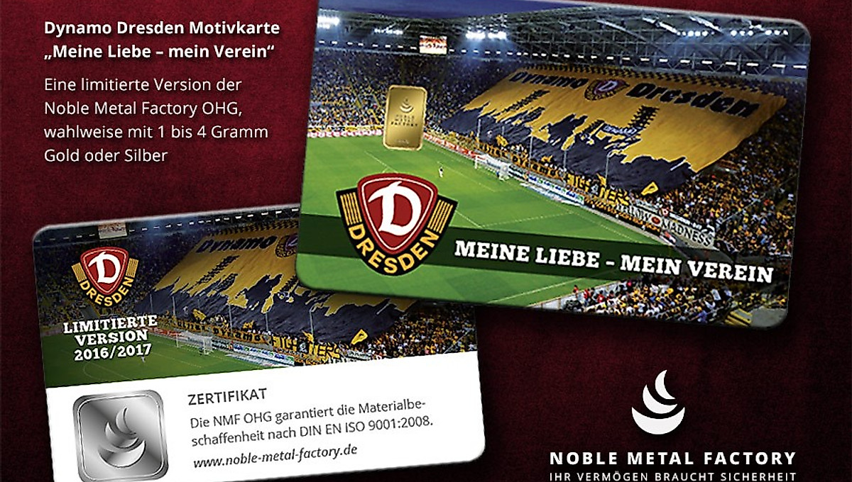 Die in Schwarzheide ansässige „Noble Metal Factory“ (NMF OHG) bietet eine Motivkarte „Dynamo Dresden“ an, auf welche ihr Gold oder Silber von 1 bis 4 Gramm prägen lassen könnt. Für Dynamo-Fans ist diese auf 2.000 Stück limitierte Motivkarte in doppelter Hinsicht eine hervorragende Wertanlage: Nicht nur, dass Edelmetalle bekanntermaßen äußerst krisenfest sind. Zusätzlich fließen von jeder verkauften Motivkarte 1,50 Euro an unsere Nachwuchs Akademie.