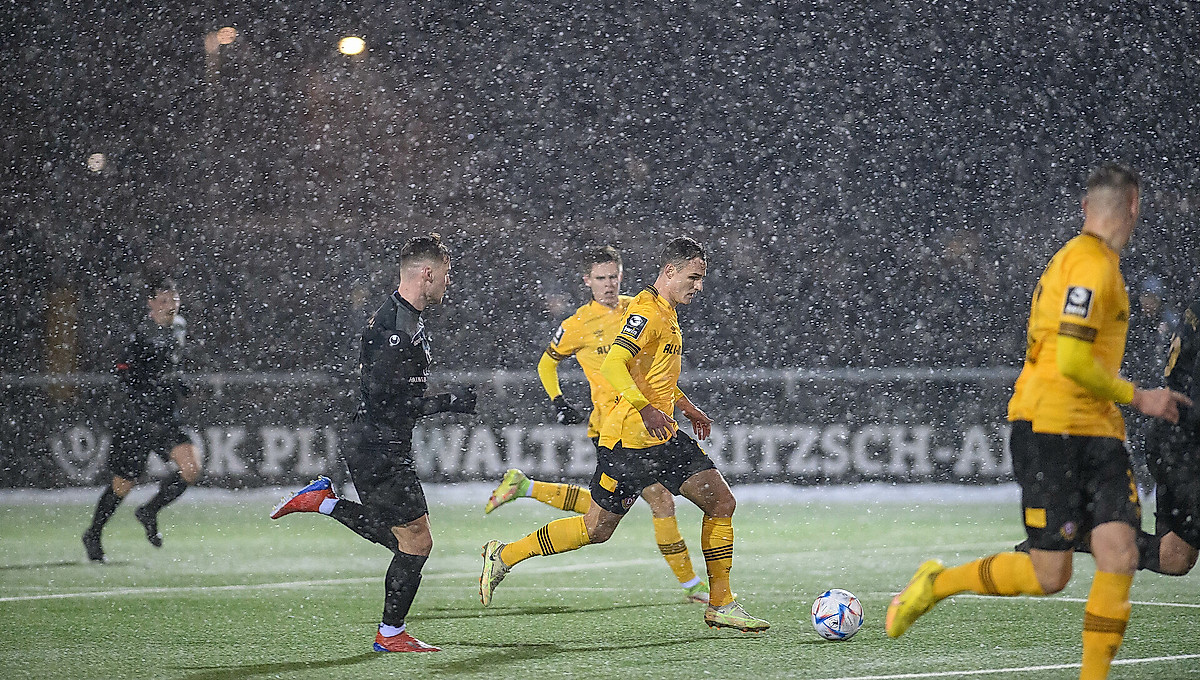 Bei Temperaturen rund um den Gefrierpunkt und einem stetig zunehmenden Schneegestöber waren die Schwarz-Gelben von Beginn an die dominierende Mannschaft, und gingen bereits nach zehn Minuten durch Patrick Weihrauch in Führung.