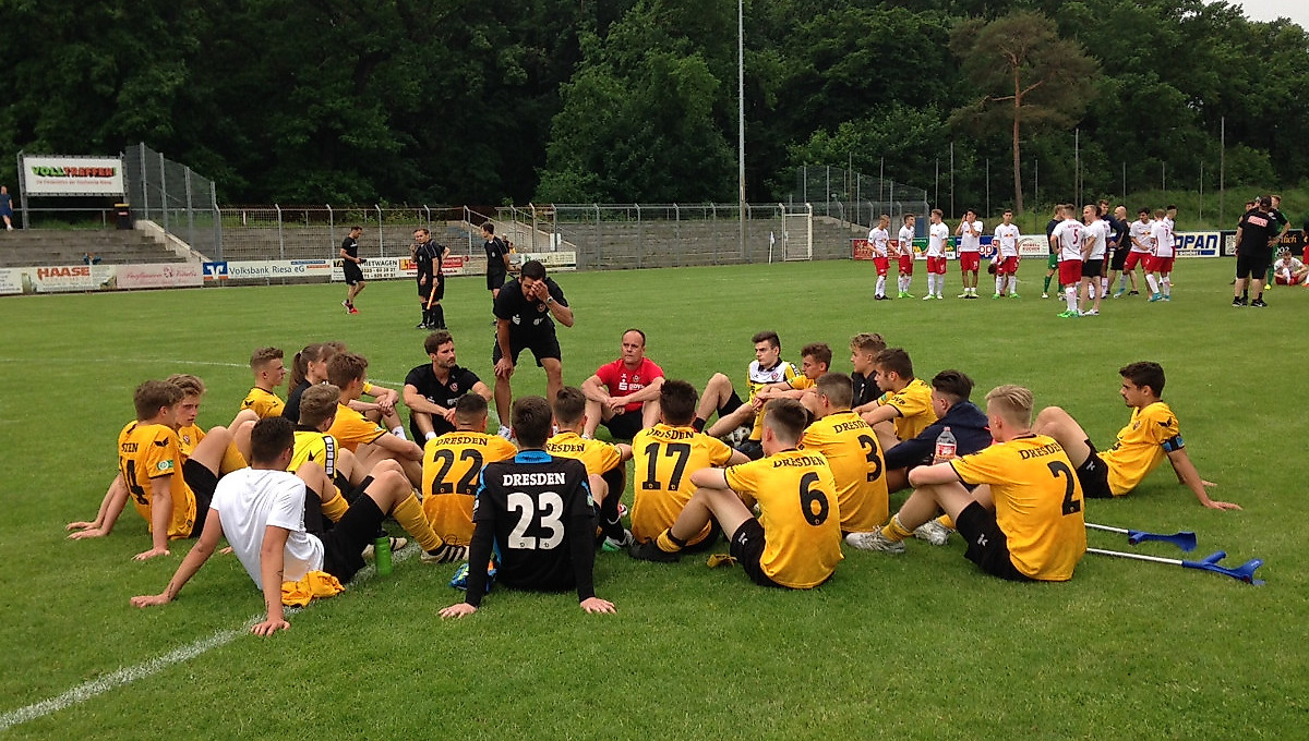 Dynamos U17-Mannschaft unterlag am Pfingstmontag vor 571 Zuschauern in der Stahl-Arena Riesa im Finale des Sachsenpokals mit 1:3 (0:2) gegen Rasenballsport Leipzig.Nach dem Bundesliga-Klassenerhalt und dem Gewinn des NOFV-Pokals im Mai wollte die Mannschaft von Trainer Cristian Fiel gegen den Favoriten aus der Messestadt das i-Tüpfelchen auf eine erfolgreiche Saison setzen. Doch vor allem im ersten Durchgang agierte Dynamo zu verhalten, um den Gegner ernsthaft in Bedrängnis zu bringen. Leipzig hingegen münzte gute Torchancen in eine 2:0-Halbzeitführung um.