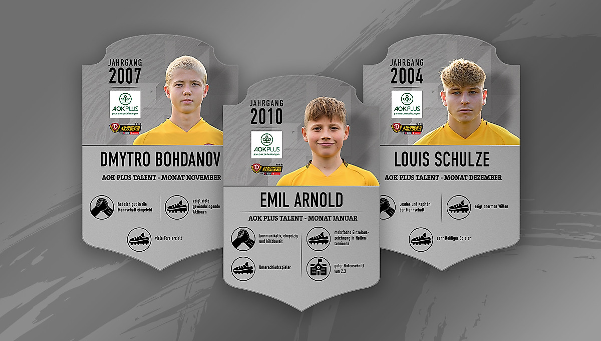 Dmytro Bohdanov, Louis Schulze und Emil Arnold erhalten von der SG Dynamo Dresden gemeinsam mit ihrem offiziellen Gesundheits- und Nachwuchspartner AOK PLUS die Auszeichnung als „Spieler des Monats“. Diese wird den Nachwuchsspielern vor dem Heimspiel gegen Viktoria Köln auf dem Rasen des Rudolf-Harbig-Stadions überreicht.
