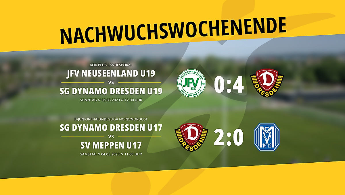 Am Wochenende musste die U19 der SG Dynamo Dresden im Sachsenpokal beim JFV Neuseenland ran. Mit einem souveränen 4:0-Sieg zog die Mannschaft ins Halbfinale ein. Die U17 konnte nach der Niederlage am vergangenen Wochenende in Hamburg ihr Heimspiel gegen den SV Meppen mit 2:0 gewinnen und damit den Klassenerhalt in der B-Junioren Bundesliga Nord/Nordost feiern.