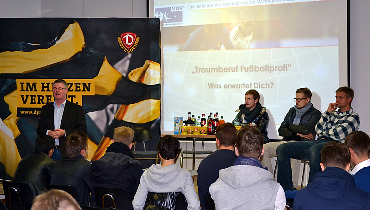 Am Anfang der Woche fand in der Dresdner Sportschule eine Informationsveranstaltung zum Thema „Traumberuf Fußballprofi“ statt. Auf Initiative vom Leiter des Nachwuchsleistungszentrums, Marcus Jahn, wurden die Nachwuchsspieler darüber unterrichtet, was sie als Fußballprofi erwarten kann. DFB-Laufbahncoach Frank Günzel und Vertreter der Vereinigung der Vertragsfußballspieler e.V. (VDV) wurde als Referent eingeladen und klärte zunächst die C-Jugendlichen über verschiedene Themen zum Profi-Dasein auf.