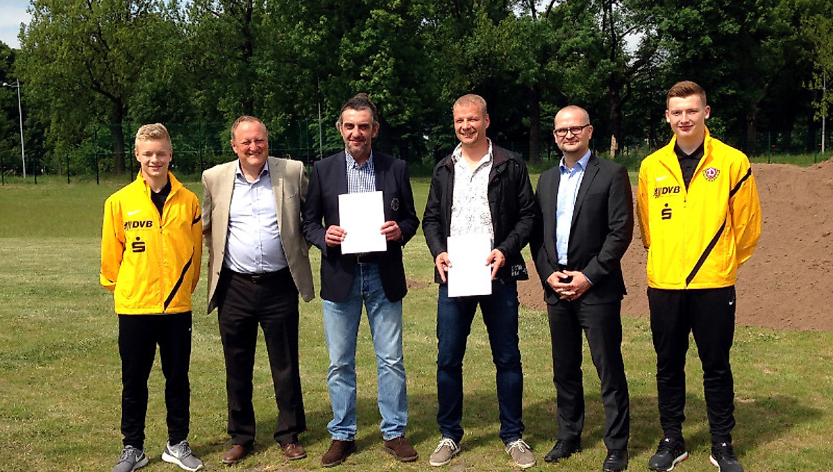 Bürgermeister Winfried Lehmann und Andreas Schumann, Referatsleiter im Innenministerium, übergaben am Montag, dem 01.06.2015, Dynamos Sportgeschäftsführer Ralf Minge und Nachwuchsleiter Jan Seifert zwei Fördermittelbescheide für den Bau eines neuen Naturrasen-Trainingsplatzes für die Nachwuchs Akademie der SG Dynamo Dresden im Sportpark Ostra.„Mit dem Neubau des Naturrasenplatzes werden die Bedingungen unserer Nachwuchsarbeit weiter professionalisiert. Alle Dynamo-Nachwuchsfußballer können dadurch erstmals seit Jahren wieder geschlossen in einem Übungsgelände trainieren“, erklärte Dynamos Sportgeschäftsführer Ralf Minge und fügte hinzu: „Möglich wird dies, weil der Verein mit Unterstützung des Freistaates Sachsen und der Landeshauptstadt Dresden eine bisher nicht genutzte Brachfläche mit einem Naturrasenplatz bebauen wird. Für die Unterstützung möchte ich mich im Namen des Vereins bei der Stadt Dresden und dem Land Sachsen bedanken.“