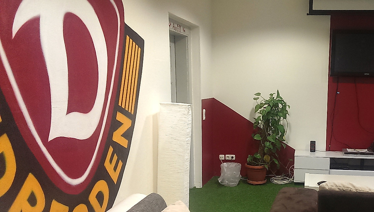 Wenn der Beamer künftig bei gemeinsamen Champions-League-Abenden Barcelona und Bayern München an die Leinwand wirft, darf das Logo des Ausbildungsvereins Dynamo Dresden nicht fehlen. Für die richtige Stadionatmosphäre sorgt der Kunstrasen, der auf einem Teil des Bodens verlegt wurde. Bevor die Jungs ihrer Kreativität jedoch freien Lauf lassen konnten, mussten sie erst einmal viel handwerkliches Geschick an den Tag legen und Decke und Wände abschleifen und frisch anstreichen.