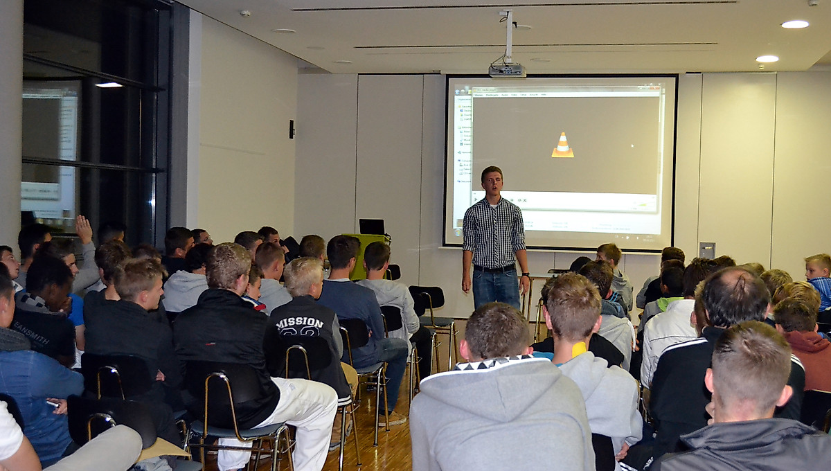 Am Montag fand in der Aula des Dresdner Sportgymnasiums die Regelschulung für Dynamos Nachwuchskicker zur neuen Saison statt. Dazu sprach Stefan Herde, Schiedsrichter der NOFV-Oberliga und der A-Junioren Bundesliga, in einem einstündigen Vortrag zu den Spielern aus dem schwarz-gelben Großfeldbereich.