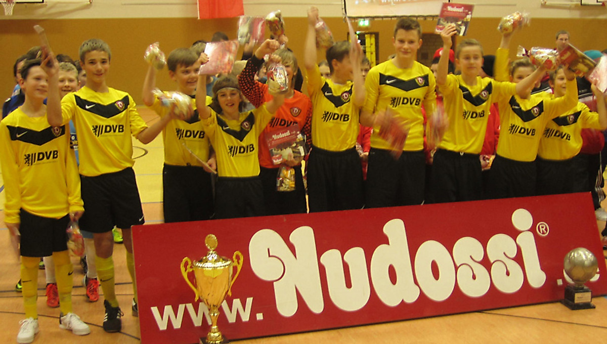 Deutlich erfolgreicher lief es für die U13 der SG Dynamo Dresden. Beim diesjährigen Nudossi-Cup in Dippoldiswalde holte das Team von Trainer Michael Weiß den Turniersieg. Dabei bot das vom Kooperationspartner FV Blau-Weiss Stahl Freital organisierte Hallenturnier von der ersten Minute an zahlreiche Höhepunkte. Vor 350 begeisterten Zuschauern gewannen die Schwarz-Gelben alle Spiele der Vorrunde. Die Gegner FSV Zwickau, Union Berlin, Stahl Freital und Lok Leipzig konnten den Dresdnern zu keiner Zeit Paroli bieten und so zogen die Dynamos als Gruppensieger ins Halbfinale ein. Da wartete die Vertretung von Energie Cottbus auf die Weiß-Elf. Und auch in diesem Spiel siegten die Schwarz-Gelben – am Ende hieß es 3:1 für die Sachsen. Im Endspiel kam es nun zum Duell mit dem Chemnitzer FC. Die Himmelblauen hielten gegen die Dresdner lange gut mit, mussten sich letztlich aber ebenfalls geschlagen geben. Auch im Finale zeigte die Mannschaft eine überzeugende Vorstellung und gewann verdient mit 5:0.