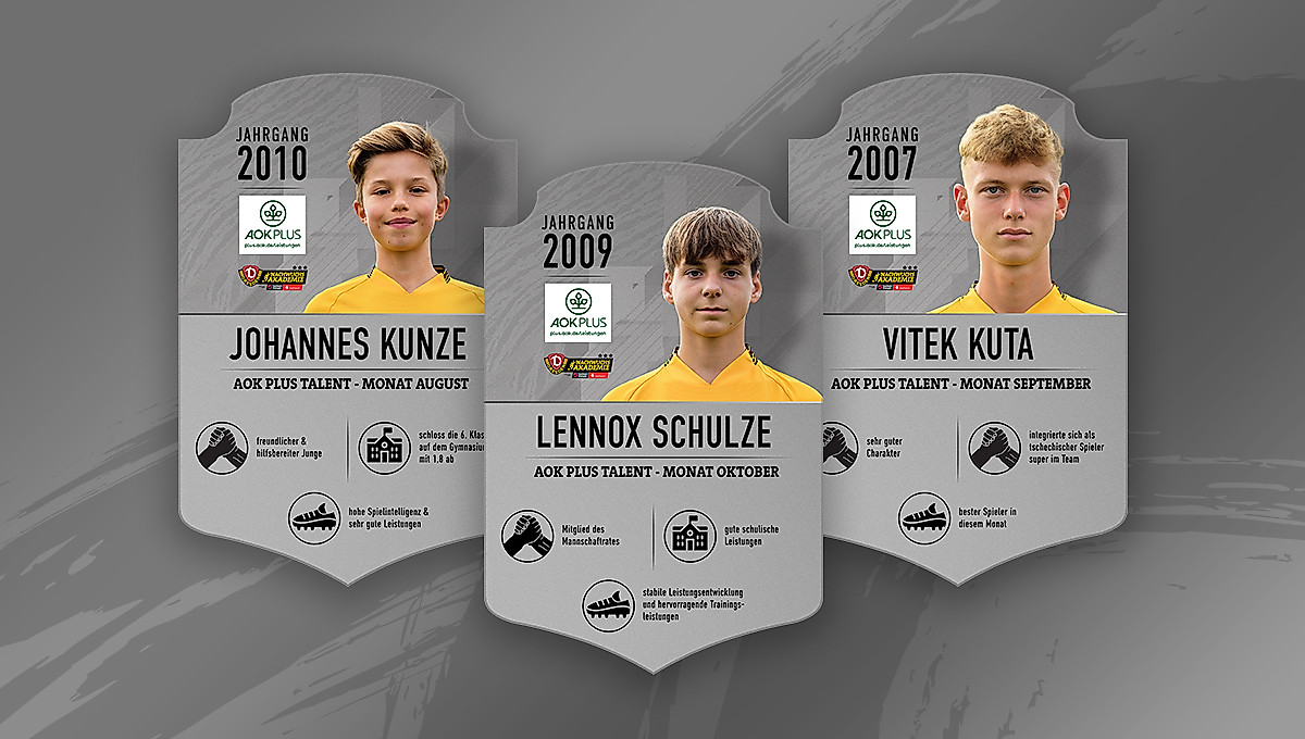 Jan Seifert, Nachwuchsleiter der SG Dynamo Dresden, sagt: „Es freut mich, dass wir nun gemeinsam mit der AOK PLUS die nächsten Nachwuchstalente ehren und auf diese Weise wertschätzen können. Johannes Kunze, Vitek Kuta und Lennox Schulze haben sich innerhalb ihrer Teams nicht nur auf dem Platz, sondern auch im sozialen Bereich und in der Schule besonders hervorgetan und sich damit die Anerkennung als ‚Nachwuchsspieler des Monats‘ absolut verdient.“
